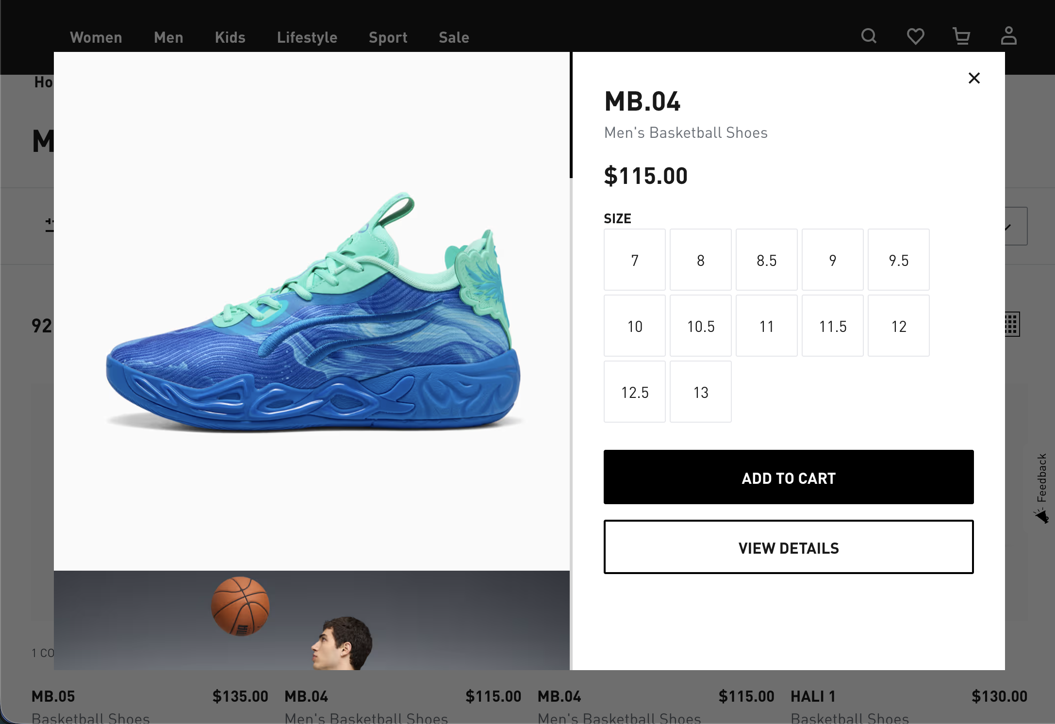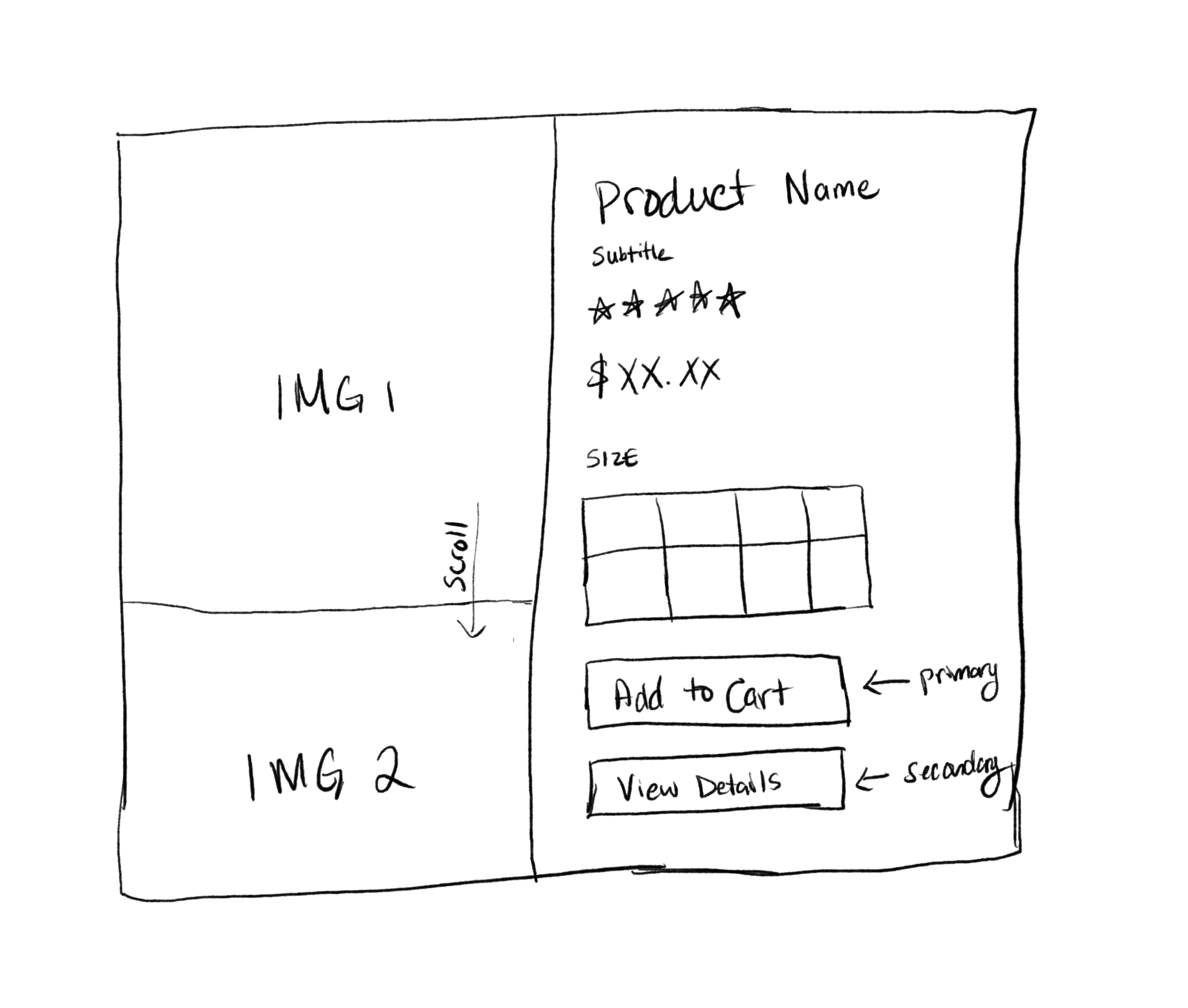 This A/B experiment presented both UX and technical challenges. The core UX challenge was in determining which elements of the product detail page were essential to support a purchase decision, and which would add unwanted complexity to a condensed modal context. I prioritized elements that directly enable conversion: images, size selection, price, and a primary add-to-cart CTA. To ensure users who wanted the full PDP experience were not stranded, I included a secondary "View Details" CTA to direct them to the full product detail page.